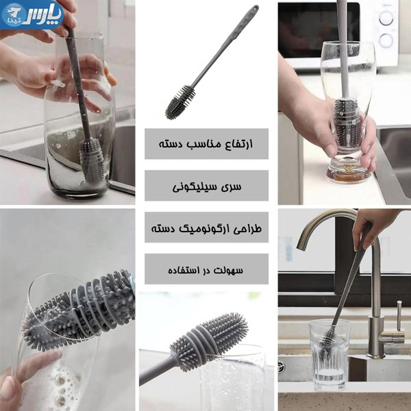 برس شیشه شور سیلیکونی ، نمونه ای جدید با طراحی ظاهری زیبا تر و البته کاربردی تر نسبت به محصولات مشابه می باشد . دسته کالا از جنس پلاستیک فشرده مقاوم بوده که با توجه به نوع طراحی ، به سادگی درون دست جای گرفته و سر نمیخورد ، بنابراین به صورت مداوم می توانید از آن استفاده کنید . سوراخ تعبیه شده در انتهای دسته نیز برای ایجاد امکان آویزان کردن محصول جهت اشغال فضای کمتر و البته دسترسی ساده تر می باشد . سری بطری شوی از جنس سیلیکون است که انعطاف پذیری لازم برای شستشوی بهتر را دارد . طراحی سری به دو شکل انجام شده ، علاوه بر حالت فرچه ای شکل ، شیارهایی در قسمت میانی وجود دارد که از آن برای شستشوی لبه بطری و فلاسک استفاده می شود ، بدین ترتیب قسمت هایی که در گذشته با بطری شوی معمولی نمی توانستید بشویید نیز امکان شستشو و تمیز کردن ساده تر را پیدا کرده اند . طول برس شیشه شور باریک برابر با 26.5 سانتی متر می باشد ، بنابراین دسته نسبتاً بزرگی دارد که شستن داخل بطری ، قمقمه های کوچک ، فلاسک و شیشه شیر نوزاد را به ساده ترین شکل ممکن فراهم می آورد .