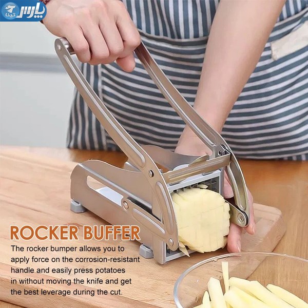 وجود پدهای مخصوص در زیر پایه های خلال کن سیب زمینی خانگی ، امکان ثابت نگه داشتن محصول بر روی سطوح صاف نطیر کابینت و میز را فراهم آ ورده . کافی است سیب زمینی را پوست گرفته و داخل محفظه قرار دهید ، حالا با فشار دست خود که به اهرم وارد می کنید ، فشار از پشت به سیب زمینی وارد خواهد شد تا به سمت تیغه حرکت و در نهایت برش خورد . قابلیت شستشو ، استحکام بیشتر ، صرفه جویی در زمان و انرژی را می توان بخشی از ویژگی های خلال کن سیب زمینی عنوان کرد . علاوه بر خلال کردن سیب زمینی می توانید سبزیجاتی مانند خیار ، هویچ و . . . را نیز خلال کرده و در سفره آرایی از آن استفاده کنید. شستشوی دستگاه و تیغه های آن نیز کار آسانی است ، برای شستشو کافیست تیغه ها را از دستگاه جدا کرده و زیر آب بگیرید، فشار آب مواد باقی مانده بین تیغه ها و قالب ها را تمیز می کند. اسلایسر سیب زمینی محصولی جدید برای آشپزخانه های مدرن است جهت افزایش سهولت کار و همچنین صرفه جویی در زمان و انرژی کاربر است .